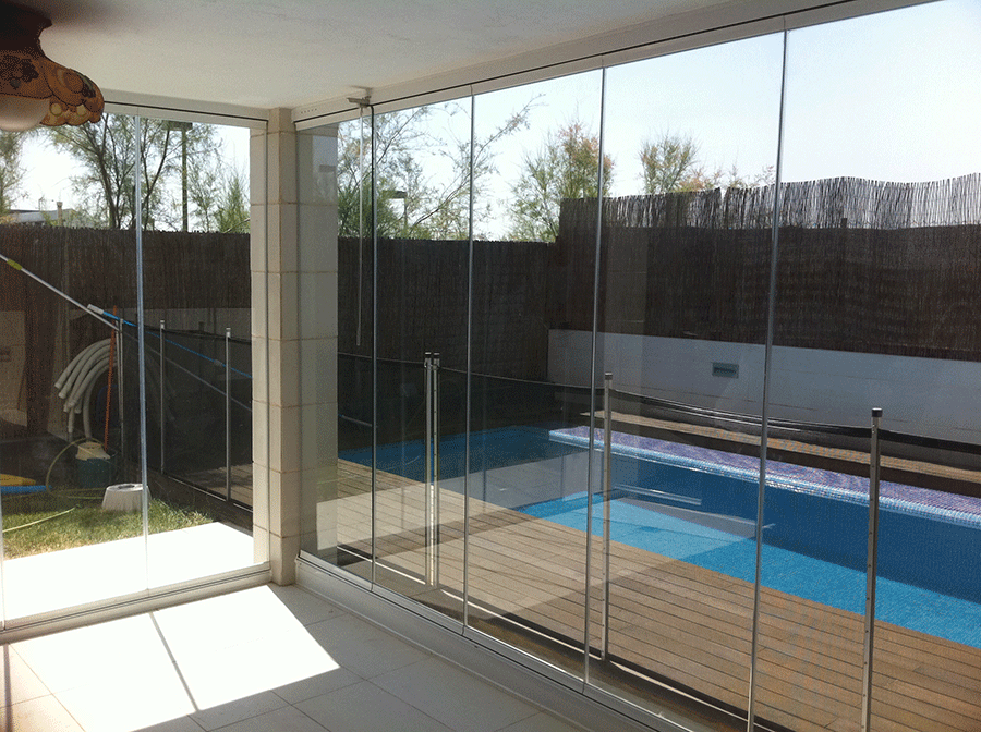 Su diseño y tecnología es una gran innovación. En nuestro producto no hay ningún perfil vertical. Se puede abrir totalmente hacia uno o dos lados, lo que da al cliente la posibilidad de tener la terraza totalmente abierta o cerrada. Éste sistema se puede montar también en terrazas redondas, ovaladas o con distintos ángulos.